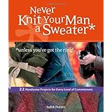 Never Knit Your Man a Sweater (Unless You've Got the Ring) ReviewI haven't knit any of the articles in this book, so I don't know if they knit up as beautiful as they look. But I want to encourage any woman who has a man in her life (or any male knitter who has a man in his life) to overlook the cute but somewhat overdone theme of what to knit for a guy after the first date, first dinner-date, first sleep-over, moving in, engagement, etc. That's a cute concept, but it could limit the audience for the book unnecessarily.There are maybe 20 patterns for men in here, and almost every one looks like something a man would actually want to wear (I'm not so sure about one sweater in a mango sort of color.) And the instructions look well laid out. Because the patterns increase in commitment level, they also increase in complexity and time and money commitment. So even if you're knitting for your Dad, you can gauge whether a headband, pair of mittens, pair of gloves (to die for gorgeous gloves), vest or Aran sweater is what you're prepared to knit. And if you're a guy who is learning to knit, you could follow the same progression. Just ignore the narrative.